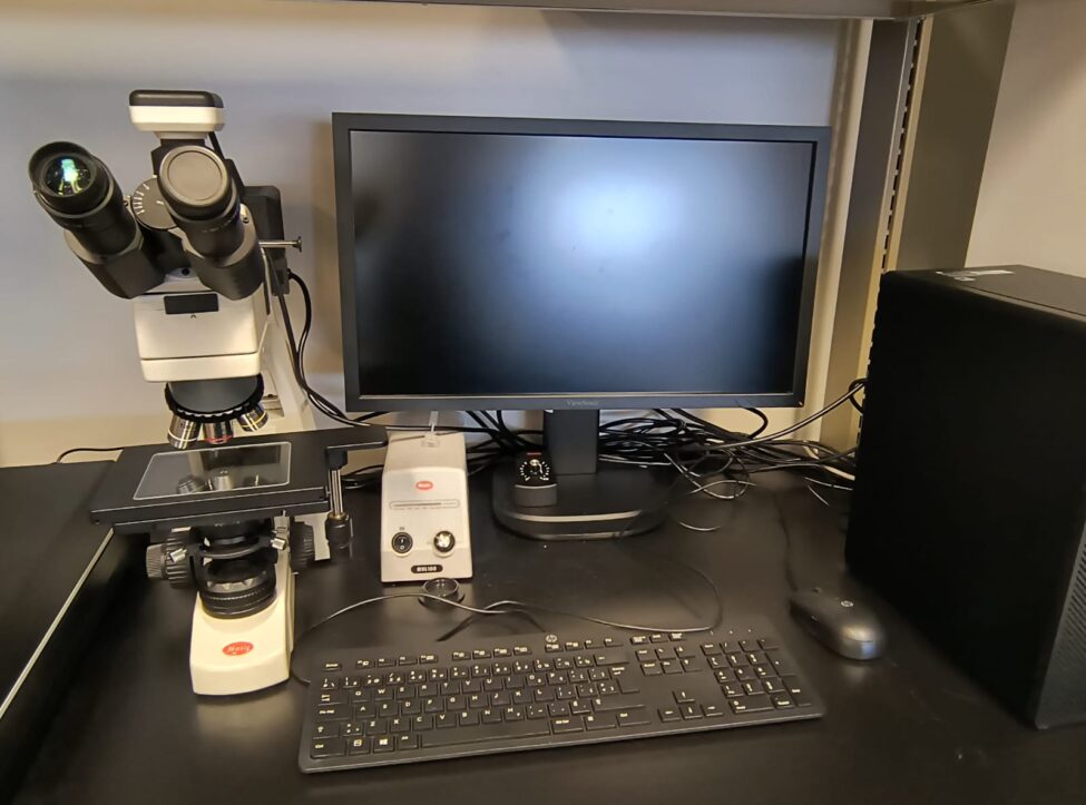 Upright microscope in reflectance for the optical characterization (up to 100X) of graphene surfaces after chip fabrication, ensuring quality assessment and defect identification.