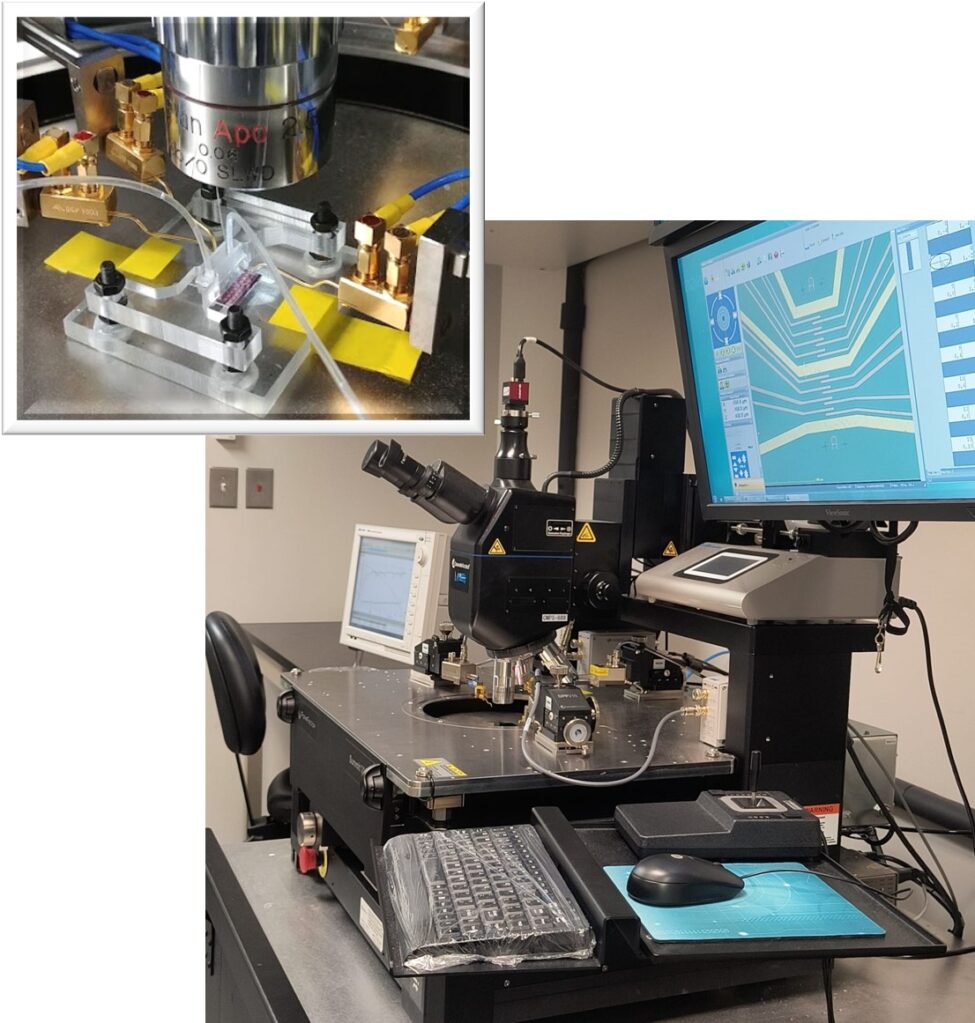 custom instrumentation integrating multiplexed electrical probing and precise flow control. It features custom software for data acquisition and analysis, enabling parallelized addressing of up to 16 devices per chip. ( Bazan, 2022)