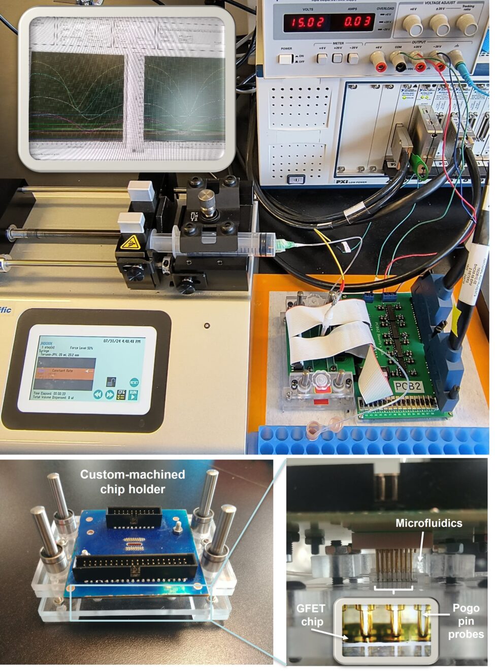 Système conçu sur mesure intégrant des sondes électriques multiplexées et un contrôle précis des fluides. Il comprend un logiciel personnalisé pour l’acquisition et l’analyse des données, permettant des mesures électriques simultanées sur jusqu’à 16 dispositifs par puce (Bazan, 2022)